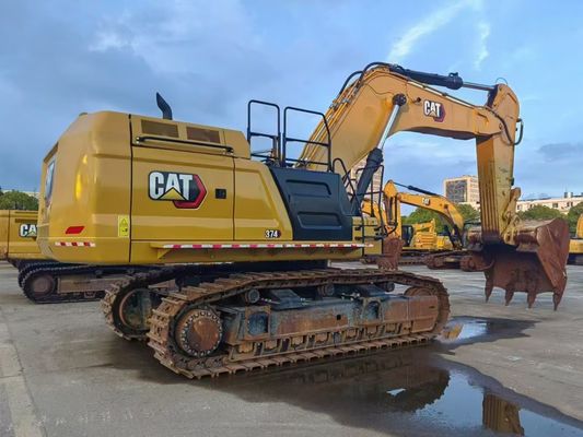 L'excavateur 374D, qui figure en bonne place sur la photo, est une machine puissante et fiable qui se démarque dans tous les milieux industriels ou de construction.Avec sa teinte jaune distinctive et la marque emblématique "CAT" affichée en évidence sur son côté, cette pelle est immédiatement reconnaissable comme un produit .